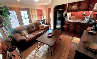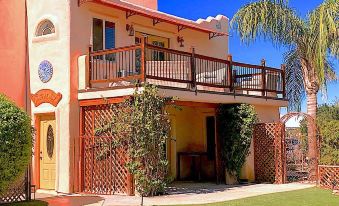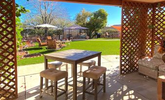 Southwest Two Story Casita for two. Warm Woodsey Living Room with Suede Sofa, 2 Fireplaces, Kitchette, Large Bathroom, Closet and Foyer. French Doors open to private Patio and rolling green courtyard with outside seating and fire pit for quiet mature couple. Beautifully Appointed Upstairs Master Suite has Fireplace and French Doors that open to a large balcony overlooking gardens with desert and Mountain views. Private Day Spa on-site with Spa Services by Appointment. Spa Robes, slippers and beach towels provided for boutique resort experience by heated Jacuzzi at the pool. Upon check-in guests are treated to a complimentary bottle of French Wine, cheese & fruit basket (or beverage of choice) to unwind at this unique relaxing retreat.