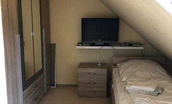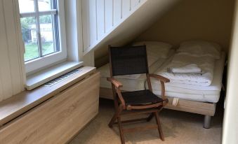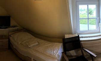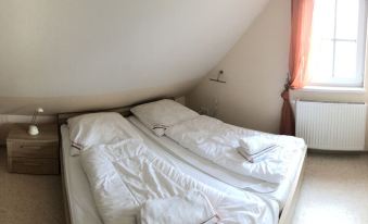 The house has a fully equipped kitchen on the ground floor and a large living and dining area with TV and fireplace. In addition, a bathroom with toilet, sink and shower. On the first floor there are two bedrooms, one with a double bed and the other bedroom with a single bed and a double bed in a cozy corner under a slope and a second large bathroom with bath, toilet and sink. Underfloor heating, wall radiators and a fireplace ensure cozy warmth even in the colder seasons.