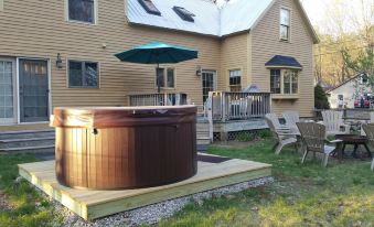 Living room features a wood stove that's perfect for entertaining with private deck leading to oversized fenced in yard with a fire pit, and a outside hot tub. Screened in farmers porch that's perfect to store your skis during the winter season or golf clubs during the warmer months with plenty of off street parking. Games, movies, netflix, books, and free wifi makes this "has it all" home a wonderful and affordable getaway within steps to fantastic restaurants, shopping, ski resorts and much more. If your specific dates are not available please check out our other VRBO listing #7462886 around the corner. that home sleeps 5. About pets:Pets allowed: dogs and cats (limit 1 total).Please call to discuss your pet..About checkOut:Check out before 10:00 AM.About children:Children allowed: ages 0-17.About customRules:Please strip all beds of their sheets, and put them and all used towels in the basket in the laundry room..Please DO NOT put any trash anywhere but the shed. There are animals at night that love to make a mess.,Kindly do not touch the WIFI or modem. they are set and say to use. if tampered with it could cause the cable not to be available..About checkIn:Check in after 4:00 PM.About smoking:Smoking is not permitted.About minBookingAge:Minimum age to rent: 21.About events:Events allowed: family gatherings and birthday parties.Maximum event attendees: 30.