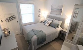 * BEDROOM #4 – Queen bed, large mirrored closet, side chair, dresser with large mirror, 2 nightstands, beachy cottage décor (cheerful blues)