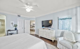 The Primary suite is a sanctuary of serenity, featuring a plush King bed and a private bathroom equipped with a walk-in shower. The suite offers direct access to the balcony, where you can start your mornings with mesmerizing views or end your evenings under the stars. The second bedroom is cozy and inviting, offering a comfortable Queen-sized bed, while the third bedroom accommodates additional guests with two Full-sized beds. For entertainment and relaxation, flat-screen TVs are installed in all bedrooms and the living room.