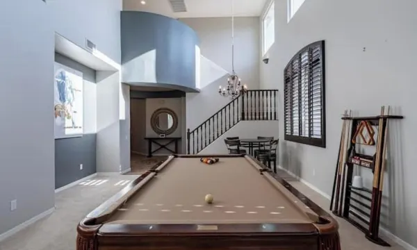 Grand entry into the home with 20ft ceilings and a fun space designed for families featuring a billiards table and pub table and chairs. Gather in small or large groups with plenty of room to stand or sit.