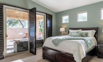 Conveniently located on the main floor adjacent to the kitchen and family room with a queen bed, bathroom w/dual sinks a separate shower and bath and a large closet. Bonus: Privacy door and private exit/entrance to the pool and patio.