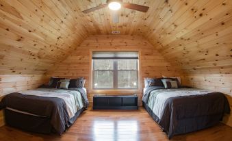 The master bedroom features a luxurious king-size bed, while the loft bedroom offers two queen-size beds. Both bedrooms boast huge windows, ideal for stargazing or enjoying the local scenery. The cabin’s log construction adds a rustic charm, complemented by hardwood floors throughout.