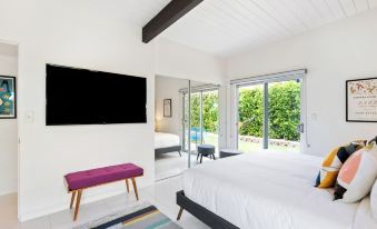 Inspired by Nina’s ‘Pastel Blues’ album which featured her well-sampled ‘Sinnerman’ track, this oversized bedroom features a full wall of abstract pastel hues. It also gives you a luxuriously soft, hotel quality king-size bed, its own private en-suite bathroom, ample closet space, wall-mounted television, and direct access to both the back and side yards with separate patio seating.