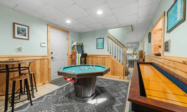 The home is spacious, with a fully stocked, well-equipped kitchen and open concept living/dining areas on the first floor. A cozy gas fireplace rounds out the living space for those cold Pocono nights!