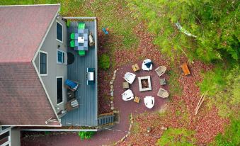 Kitchen leads out to a spacious deck area with dining table, rocking chairs and propane gas grill. Steps down from the deck lead to a private fire pit area with built-in stone fire pit and polywood adirondack chairs.