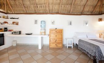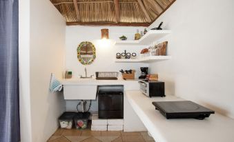 This studio is unique in that is has been built with a traditional palm thatched roof called a palapa. It is well equipped for up three guests and has everything you will need for a comfortable stay- new pillow top mattresses with cotton linens, kitchenette including coffee maker, purified water, small fridge, electric stove, toaster oven and complimentary margarita bar.
