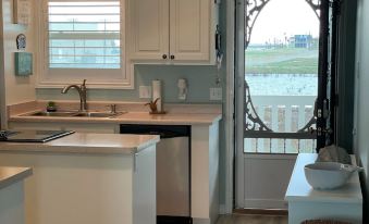 OR If you love quiet mornings you can listen to seagulls on the 45 foot back deck while watching the sunrise. And peaceful evenings can be spent enjoying a glass of wine and watching the sunset from the front deck. Herons, roseate spoonbills, and other birds feed in the natural pond across the single lane one way street from Lee's Landing.