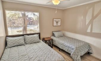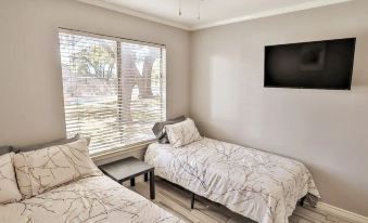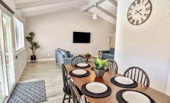 Unique mid-century modern home with vaulted ceilings and real ceramic tile throughout. The space is bright and airy with 3 spacious bedrooms and 2 baths. Sleeps 8 guests in bedrooms (or up to 10 guests with a queen air mattress).