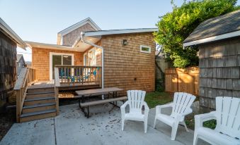 Head upstairs to find the remaining three bedrooms and bathroom. Two of these bedrooms contain queen size beds. The third bedroom, perfect for the children in your group, offers a bunk bed setup with a full on bottom and a twin on top. There is also a bathroom containing a walk-in shower on this floor. Back downstairs to the backyard, you'll find a back porch with more outdoor seating, a BBQ, and a small backyard to hang out in after a long day on the boardwalk and walking the beach!