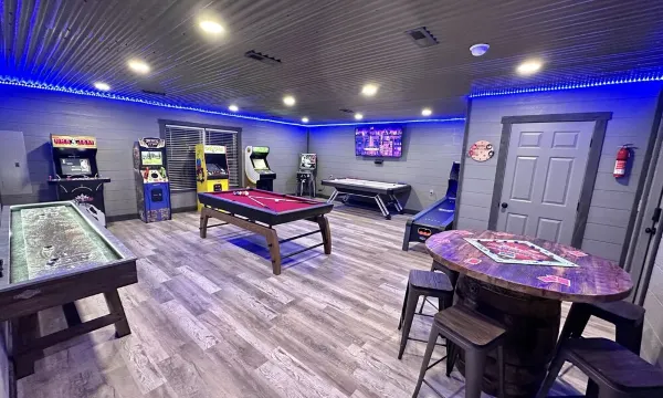 Awesome Renovated Lake Cabin w/Great Views. Close to Pigeon Forge & Gatlinburg. 4 bedrooms & 3 baths Plus a Theatre Room & Game Room w/arcades, pool table & shuffle board. Smart TV in every bedroom. Free HIGH SPEED WIFI/internet, Great for Zoom Calls & Online Schooling.