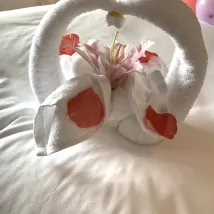 وسائل الراحة: تتميز غرفتنا المُحسّنة بتراسين، وحمام واسع بمناطق مُنفصلة للتنظيف الجاف والرطب، وحوض استحمام. كما تم تزويد الأطفال بفرش أسنان ونعال.