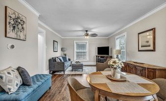 The flexible sleeping area cleverly converts from a twin bed to a trundle-style king bed, doubling as a convenient workspace — perfect for both rest and productivity. The master bedroom boasts a luxurious king-size bed for peaceful nights and sweet dreams. Gather around the dining area set for four and enjoy meals, games, or conversation in a warm, inviting space.