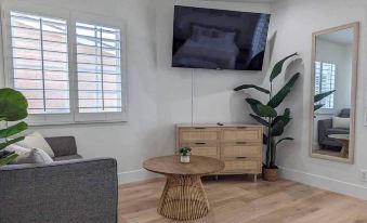 The space is completely private but is attached to the main house so slight noise is possible. As you walk in you are greeted by a compact but well equipped kitchen (sink, fridge, electric stove top, and microwave) and a dining table beside it. The memory foam queen bed is lined with plenty of pillows and blankets to meet your comfort needs. The 58inch TV can be seen right from the bed or the cozy couch. The bathroom has a new modern look with a spacious stand up shower. Plenty of natural light enters, combining perfectly with the natural tone colors and vibrant plants, to give the room a pleasant and elegant look. No parties, drugs or smoking allowed. The studio shares a wall with the main house. There is an exterior ring camera facing the studio entrance.About pets:No pets allowed.About checkOut:Check out before 11:00 AM.About children:Children allowed: ages 0-17.About customRules:No parties, no drugs and no smoking in or on property. Noise and smells will travel into the main house..Quiet hours: 10pm-7am.About checkIn:Check in after 3:00 PM.About smoking:Smoking is not permitted.About minBookingAge:Minimum age to rent: 18.About events:No events allowed.