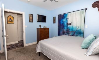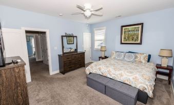Upstairs, the Master bedroom (King) has its own full bathroom, smart TV, closet, dresser, and a balcony facing the front yard. The two river-facing bedrooms (one Queen and one Twin-over-Full bunk bed) share a balcony with amazing river views and a hallway full bathroom. Both bedrooms have closets and dressers.