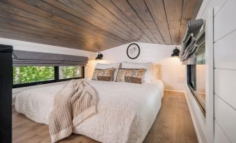 *A sleeping loft accessible by stairs with queen size bed, wall sconce lighting and outlets for charging your devices (you cannot stand in the loft as this is a true tiny home RV). The downstairs private bathroom features a tiled shower with washer/dryer combo, sink and toilet. Spa robes are in the linen closet along with a supply of towels and extra blankets.