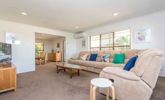 With an ideal setting for a memorable family holiday, this gorgeous beachside home caters perfectly for up to 8 guests in complete style and comfort. Tucked away in a quiet cul-de-sac with a lovely elevated position which captures the cooling ocean breezes and is within a short stroll of Sunrise Beach.