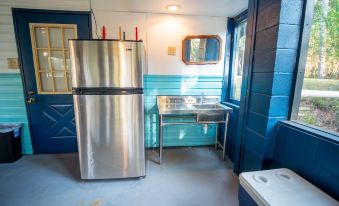 The view of the river from the deck is spectacular morning or night; enjoy your coffee or favorite beverage in the high-top chairs! Downstairs, host your guests for grilling. Two folding tables, a gas grill , refrigerator and sink downstairs as well as a Bluetooth speaker tower to accommodate you.