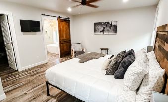 The master suite comprises the entire upstairs which features a king bed with a gel cooling mattress,walk-in closet, Smart tv, and cozy sitting area.