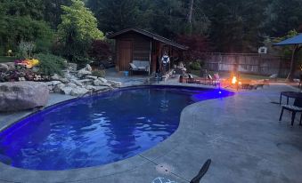 Sliding glass door in the dining room leads out to the pool deck where you will enjoy an in ground swimming pool (not heated but regularly hits 80 degrees in the summer months). There is cozy two person hot tub tucked in the landscaping next to the outdoor shower. Snuggle up to the gas fire pit after you BBQ some steaks on the Weber grill. There is corn-hole, badminton, and ladder ball outside. Inside there are plenty of board games, cards, art supplies, and arcade cocktail table with hundreds of games to choose from.