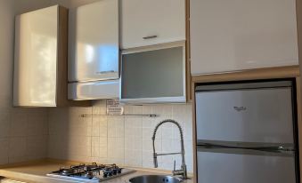 La cucina è attrezzata con stoviglie, piatti, pentole, frigo, lavello e dispone di un ampio piano per cucinare.