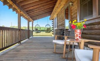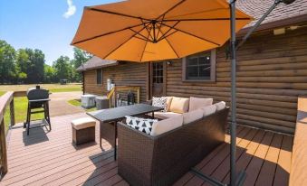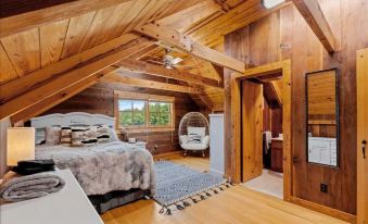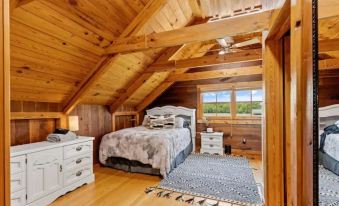 This beautiful, open air log cabin, spans a large family owned land mass & was built by the owners hands from the ground up having been preserved well & has become a curated space for guests to come enjoy and experience HOME away from HOME, whatever your style or vibe is for your stay! The home sleeps up to 6-8 comfortably on two queen beds being available, two twin beds, & a futon in the loft area.