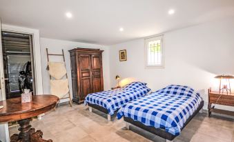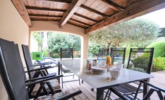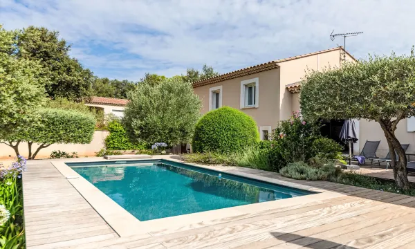 Beautiful, cosy single-family house "La Romaine", surrounded by trees. Property composed of main house and outbuilding, on the outskirts, 400 m from the centre of Vers Pont du Gard, in a quiet position in the residential district, 400 m from the edge of the forest, 80 km from the sea, 6 km from the river, south facing position. Private: beautiful, well-kept garden 1'000 m2 (fenced) lawn and wildlife garden, swimming pool angular, with privacy (7 x 4 m, depth 160 - 160 cm, seasonal availability: 15.Apr. - 15.Oct.) with internal staircase and alarm system. Outdoor shower, terrace (30 m2), garden furniture, barbecue, pool maintenance by the owner/gardener. In the house: air conditioning. Grocery 600 m, supermarket 8 km, shopping centre 4.2 km, restaurant, bar 850 m, bicycle rental 4.2 km, bus stop "Le Vieux Lavoir" 10 km, sandy beach "Grau du Roi" 80 km. Sports harbour 24 km, golf course (9 hole) 11 km, riding stable 3.3 km, walking paths from the house 5.7 km. Nearby attractions: Le Pont du Gard 3.7 km, Cité Médiévale d'Uzès 13 km, Avignon 28 km, Nîmes 40 km, Les Baux-de-Provence 45 km, Abbaye de Saint-Roman 21 km. Well-known lakes can easily be reached: La Bouscarasse 20 km. The owner does not accept any youth groups. "La Romaine", 5-room house south facing position. Spacious, beautiful and tasteful furnishings: large living/dining room 40 m2. Exit to the terrace, to the swimming pool, south facing position. Open kitchen 10 m2 (dishwasher, 4 induction hot plates, toaster, kettle, microwave, freezer, electric coffee machine, cooking island). Exit to the terrace, to the swimming pool. Air-conditioning. On the lower ground floor: 1 room with 2 beds (90 cm, length 190 cm), shower/WC, double hand-basin, TV and flat screen. Exit to the garden. Upper floor: 1 room with 2 beds (90 cm, length 190 cm), bathroom, separate WC, bath/shower and double hand-basin. 2 rooms, each room with 1 french bed (1 x 160 cm, length 190 cm). Terrace 8 m2, west facing position, large terrace 30 m2, south facing position. Terrace furniture, electric barbecue, deck chairs (8), sitting area. Facilities: washing machine, dryer, children's high chair, baby cot, hair dryer. Internet (WiFi, free). Parking (fenced 4 cars). Please note: suitable for families one double bedroom is outside the apartment. Maximum 1 pet/ dog allowed. Smoke alarm. Offer by a private individual according to Art. 155, IV of CGI.