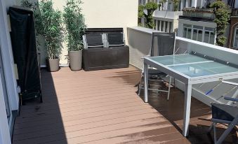 The apartment is in the 1. Floor = DG with a size of about 58 square meters is equipped for 4 people. One bedroom (with TV) with double bed, a sofa bed in the living room and 2 single beds in the loft for children. The apartment has characterful, well-kept shipboards as a floor. The large sun terrace to Friedrich-Franz-Str. invites you to a relaxing stay, reading and clapping.