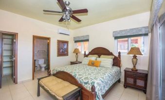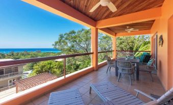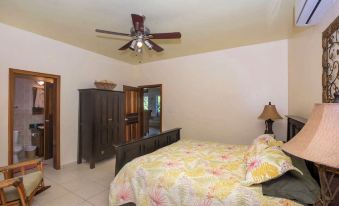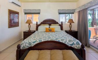 This fully air-conditioned second floor condo has everything you will need while on Roatan. Decorated with Honduran art, this condo is right in the heart of West End yet in a calm and quiet oasis. With all local and sustainably sourced Honduran Hardwood cabinetry, you can relax in comfort. The master bedroom has a King sized bed and an en-suite bathroom; a second bedroom with a King bed; a fully equipped kitchen with a breakfast bar, cooking island, granite counter tops, and modern appliances; a washer and dryer; a large dining table perfect; and a living area with a sofa, love seat, and a TV. Enjoy unparalleled views of the ocean and the sunset from the balcony. The balcony also has a dining table, and a chaise lounge which is perfect for relaxing with a cold beverage after a long day at the beach. This luxurious 1600 square foot condo comfortably sleeps 4 people.