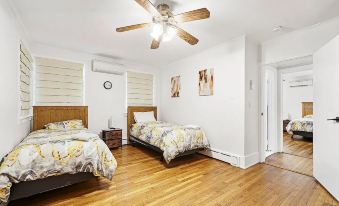⦿ Primary with two queen beds, sitting area, ensuite full bath, walk-in shower, and soaking tub