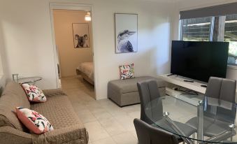 Bliss. So close to everything and yet so quiet and peaceful and beautiful. For animal lovers like ourselves it was brilliant to see all the gorgeous horses, ponies, goats, chickens, sheep, rabbits and guinea pigs! The scenery from our apartment looking across the farm and hills was very beautiful. The bonus was being able to take our family dogs who loved walks on the farm amongst it all and their off lead play that was made possible by the enclosure in front of the tennis court apartment. Our hosts Michael and Jenny were brilliant and so accomodating-could not have been more helpful! The farm tour was fantastic also. We will be back!