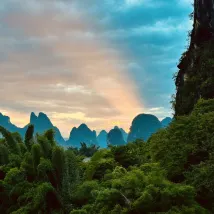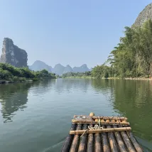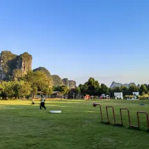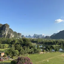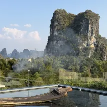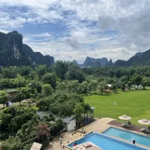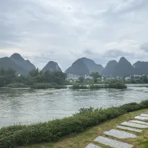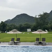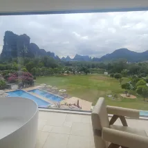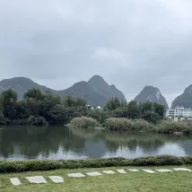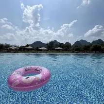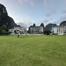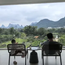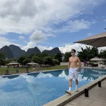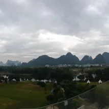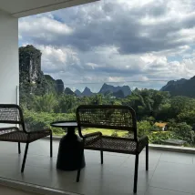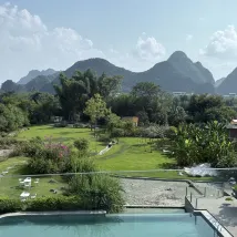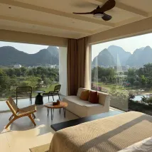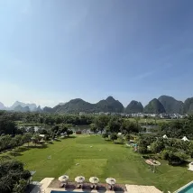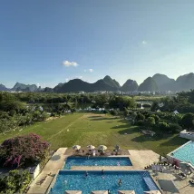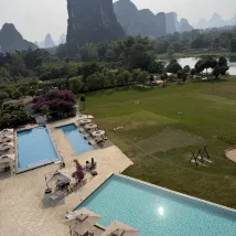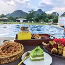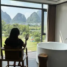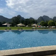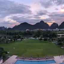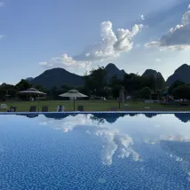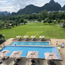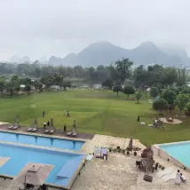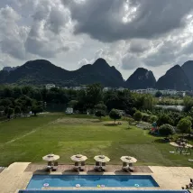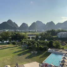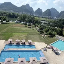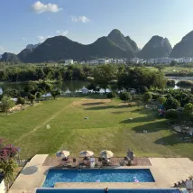 استغرقت رحلة القارب من قويلين إلى يانغشو أربع ساعات ونصف. حجزنا هذا المبيت والإفطار على موقع Ctrip. كانت التقييمات إيجابية للغاية، وكانت الأجواء جميلة، لذا حجزنا غرفة مزدوجة. عند وصولنا، كنا في غاية الروعة. كانت الغرفة منعشة ومشرقة. عندما فُتحت الستائر، بدا المنظر الخارجي وكأنه ملاذ في جنوب شرق آسيا، مع مسبح وجبال متدحرجة ومروج خضراء - كان مذهلاً للغاية.