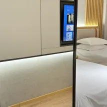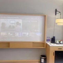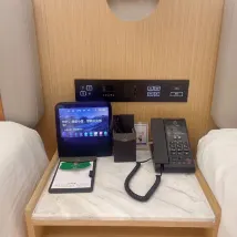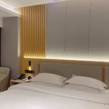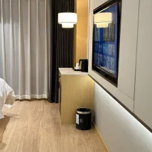 The hotel lobby has a warm color scheme. The front desk receptionist Liu Mei provided good service. She arranged a projection room near the community, which has a good viewing experience. The bedding is soft and comfortable for a good sleep. The disposable slippers are hygienic and comfortable, and they also gave us a cold drink!