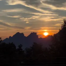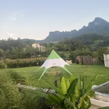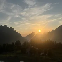 في الصباح، استيقظتُ على ملامسة أولى خيوط الشمس الرقيقة، وفتحتُ عينيّ على شروق الشمس الأخّاذ من النافذة. غمرت أشعة الشمس البرتقالية المحمرّة الغرفة، خالقةً جوًا دافئًا ومريحًا أضاء مزاجي على الفور طوال اليوم. عند صعودي إلى منصة المراقبة، استقبلتني مناظر طبيعية خلابة لا متناهية. غمرت الجبال والحقول بألوان حالمة، آسرة، ومنحتني شعورًا بالسلام الداخلي.