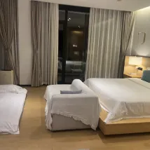 كانت الغرفة واسعة ومشرقة. من سريري، استطعتُ مشاهدة شروق الشمس وغروبها المذهلين. 🌅 شعرتُ وكأن السحب البيضاء والسماء الزرقاء تحاولان التسلل عبر النوافذ الممتدة من الأرض إلى السقف. كان الموظفون ودودين للغاية. والأكثر إثارة للدهشة أنه قبل تسجيل وصولي، كانت مدبرة المنزل قد بدأت بالفعل بشراء التذاكر وتخطيط برنامج رحلتنا وترتيب خدمة النقل. كان تخطيط مدبرة المنزل لمسار رحلتنا مفيدًا للغاية. كما كان الموظفون في غاية اللطافة، باستثناء المالك الذي كان يتمتع بروح دعابة مميزة.