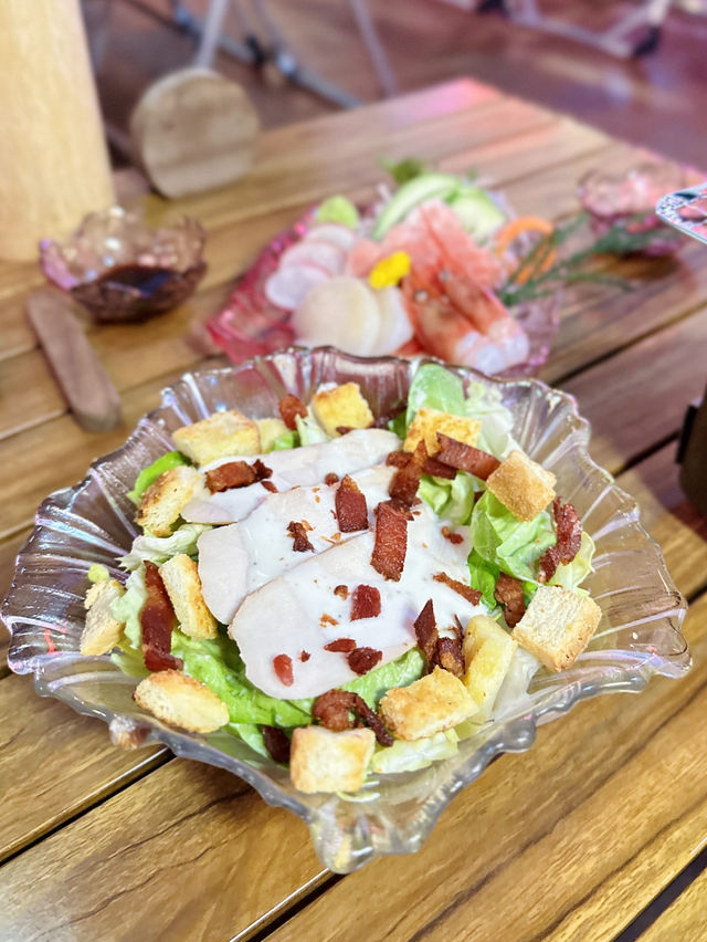 The restaurant is themed around camping life, decorated with wooden design and camping style combination, with outdoor seating, tonight the weather is cool and comfortable, we chose to sit outdoors. An open-air izakaya in a busy city is really rare. The largest outdoor table can seat 10 people, and there is a large tent, which is perfect for large groups of people to gather. Coinciding with Christmas, a large Christmas inflatable doll was set up outdoors, creating a festive atmosphere. The restaurant is headed by a Japanese chef and specializes in Japanese barbecue, sukiyaki, wagashi and sake. We ordered the [Winter Christmas Camp Warm Meal for Two], eat beautiful meat ~ [Appetizers Japanese Slow Cooked Chicken Breast Caesar Salad] Chicken, of course, is chicken, slow cooked chicken breast is much more tender than turkey, served with bread crumbs, bacon crumbs, and fresh lettuce. Choice of 3 main dishes, we chose [Japanese Miyazaki A4 Wagyu Five Points Grilled Food Set], in addition to broiler, beef short ribs, there are also rare parts monk head, turtle son, friend triangle. Wagyu is rich in fat, the fire is quite strong when burning, campfire is enough atmosphere. The mouth is full of oil and meat, which is very satisfying. Platter of 2 choices, chose sashimi. The big togto is plump, the scallops are big, the sweet shrimp and shrimp are smooth, and they are of high quality. There are also many Christmas specials and Christmas desserts, special drinks in cups with colorful flashing lights. Camping Life 📍4/F, Golden Plaza, 502 Hennessy Road, Causeway Bay #campinglife #CausewayBay
