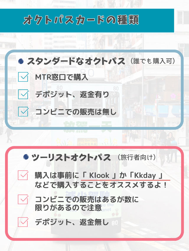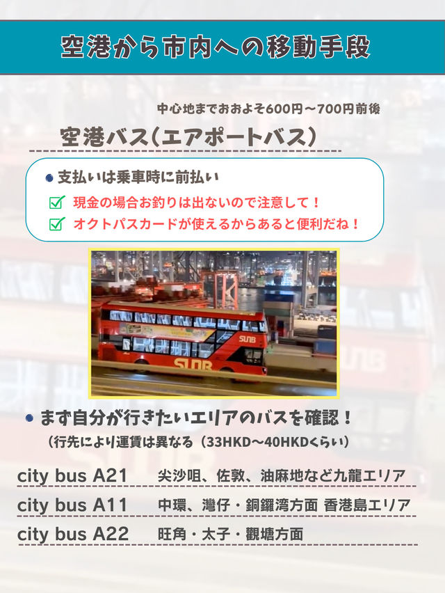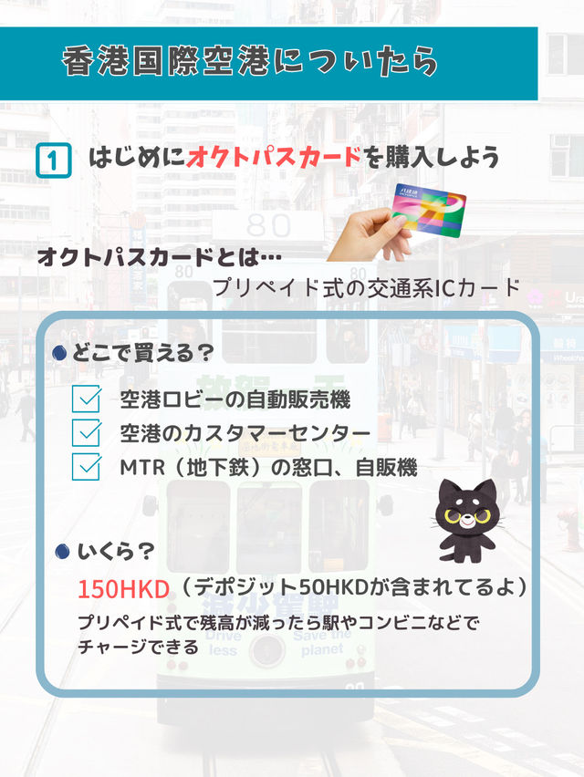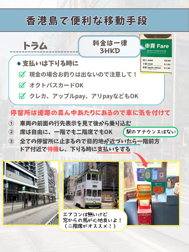 Various Transportation Options in Hong Kong How to Get Around Hong Kong? ◆From the Airport to the City ◆How to Get Around the City, etc. We've put together a list of transportation options, so please use it as a reference and enjoy a smooth sightseeing experience!❣️ First, when you arrive in Hong Kong, get an Octopus Card! The Octopus Card is a transportation IC card, similar to Japan's Suica! It's convenient to have one, as it can be used for trains and buses, as well as for shopping and dining (depending on the store). ◾︎There are several transportation options from the airport to the city, so plan which one is best for you! ◾︎Trams Hong Kong is famous for its double-decker trams! We love sitting on the second deck and enjoying the view from the window while traveling.💕There's no air conditioning, but the breeze through the window is lovely! You can ride it on Hong Kong Island, so be sure to take it for a memorable trip! 😽 ◾︎Star Ferry A ferry that runs between Kowloon and Hong Kong Island. A convenient mode of transportation used by many Hong Kong residents! A short cruise is sure to get you in the travel mood! It's affordable and comfortable. The view of Victoria Harbour from the boat is also amazing! For tourists, we recommend the Tsim Sha Tsui to Central route (9 minutes). 😸🚢 There are many transportation options in Hong Kong, so choose one based on your desired destinations and travel time! #SummerCampaign #HongKong #HongKongTrip #AsiaTrip