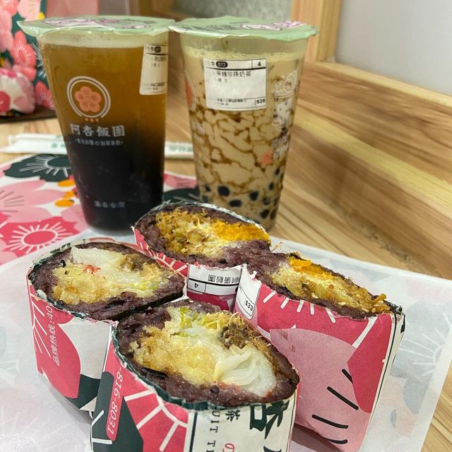 📍Ah Keng Rice Ball Busy day~ For lunch, I had the celebrity crabmeat purple rice dumpling ($39) and black sugar pearl fresh milk ($26) for takeaway. The purple rice is very soft and glutinous, the taste is particularly great, using salad dressing with crab meat, minced meat, the taste is overall light and fresh. I think purple rice tastes better than white rice. It's soft and glutinous and healthy. My favorite is the black sugar pearl fresh milk, the milk is rich, the black sugar is sweet and not greasy, blended just right, the pearls are soft and chewy. My colleague ordered the hibiscus salted egg rice ball ($33) and the elixir jasmine ($22). Also, the ingredients are plentiful, with a whole salted egg yolk, plus other ingredients, very tasty! The elixir jasmine has a very soft elixir ice cream, a small straw is ok is a refreshing taste! Available! If you don't like sweet, you can try the flavors☺️ Very filling, eat one lunch and you really won't be hungry! 🤣💕 P.S. The store is really beautifully designed, Japanese cherry blossom design, I couldn't help but take a picture 💕💕💕 📍: Shop 18C, G/F, Donghai Business Centre, 98 California Avenue, Tsim Sha Tsui 🚆: Tsim Sha Tsui Station, about 5 minutes walk #foodie #foodlover #foodstagram #hkfood #hkfoodie #hkfoodblogger #hkfoodlover #chinesefoods #hongkongfood #hongkongphoto #photofood #purplerice tour #healthyeating #takeaway