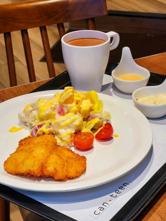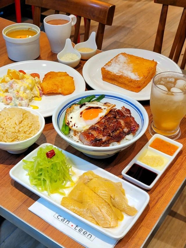 For a number of workers, whether after lunch, 3:3 or OT treatment, want cheap, beautiful, good. Seeing the newly opened can.teen in Lan Kwai Fong in Central, the location is convenient and the food quality, taste and appearance are better than ordinary fast food chain restaurants. This place specializes in homemade grilled meat. This time we ate the rice and Hainanese chicken rice, and of course the affordable tea set. The Royal Sad Rice $59 The char siu is semi-fat and lean, the crust is slightly charred, and the meat is tender and seasoned. It is indeed well made. Served with crispy-sided sun-cooked eggs, tossed with white rice, filling and delicious. Signature Deboned Hainanese Chicken $69 The Hainanese chicken has tender chicken, smooth skin and rich chicken flavor, and is very rich with oil rice, refreshing asparagus shreds and medium broth. Special mention is made of the pumpkin, chestnut and carrot pork bone soup. It is sweet and rich, with enough ingredients. Mango salad. Crispy fried fish fillets $38 The salad contains mango, potato, apple, etc., which is healthy and has different tastes. Even with the addition of fried fish, it doesn't feel so evil. Spotted Coconut Curry Toast $35 The toast is fried until golden and crispy, the bread inside is soft and tender, filled with mottled coconut curry sauce, and can be drizzled with condensed milk, syrup and butter. The tea set itself is served with hot drinks. I ordered a cup of milk tea. The tea is fragrant and smooth, with the taste of Hong Kong-style cha cha cha. Another cup + $ 10 switched to Thai longan ice, the taste is sweet, and whole longan meat. . . can‧teen (Central) Shop A, G/F, Century Plaza, 1-13 De Keyser Street, Central . . @can.teen.official @maximshongkong #canteenhk #Thai #RoyalRice #LanKwaiFong #DoubleDishRice #QuinoaRice #CenturyPlaza #HongKonggoodplaces #familygoods #foodie #localtour #cafe