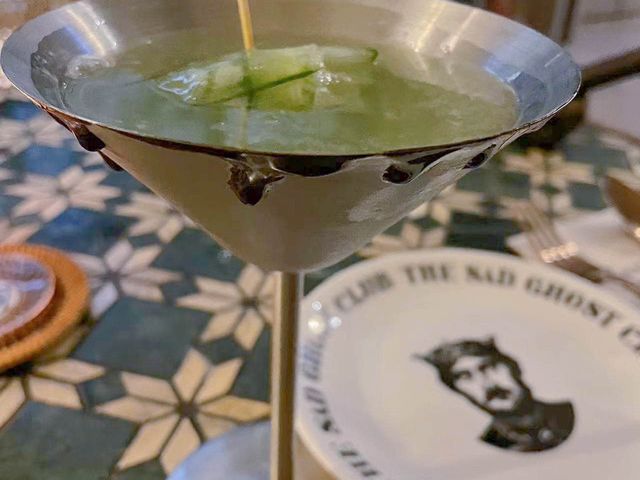 (维元元) There are two new retro cafe & bar in Nanli, 🤓 Haunted is the one inside, moved over in Causeway Bay, retro decoration, the first floor leading to the second floor dining corridor is covered with murals, ✨ very feel, the dishes are very characteristic ~ 。 🥘Curry mille-feuille, vegetarians can try 。 Osmanthus glutinous rice stuffed grilled chicken breast, 🐤 filled with super fragrant three glutinous rice, the outer layer should be coated with honey, sweet. 。 Matcha brown rice ball grapefruit soda🍵Genmaicha Yuzu Soda With Mochi, the small ball is still freshly baked, just started the soda to drink sweetness, ice cubes melt away the bitterness of matcha will be obvious. 。 🥒Cucumber papa, chocolate is actually applied on the rim of the cup, and the gin flavor is so good. #cafe #hkcafe #hongkong #chineserestaurant #localfood #hkfoodie #hkfood #instalike #hkblogger #hk #hkiger #followmeandfollowback #hkfoodblogger #hkcafe #cakehk #hkiger #daily