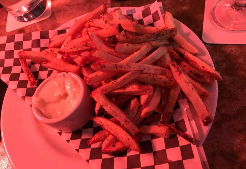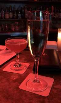 It's more like a bar than a coffee shop. The sparkling wine is good, and the environment is also good. The lights are red, and it feels like a bar. The dishes are good. They are all snacks.