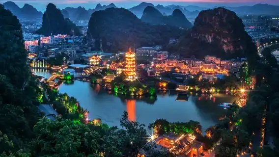 Take a night cruise on the Two Rivers and Four Lakes to admire the scenic beauty of Shan Lake, Rong Lake, Gui Lake, Mulong Lake, and the urban sections of the Li River and Taohua River. Explore Guilin's core scenic belt and experience a waterway system that rivals Venice.